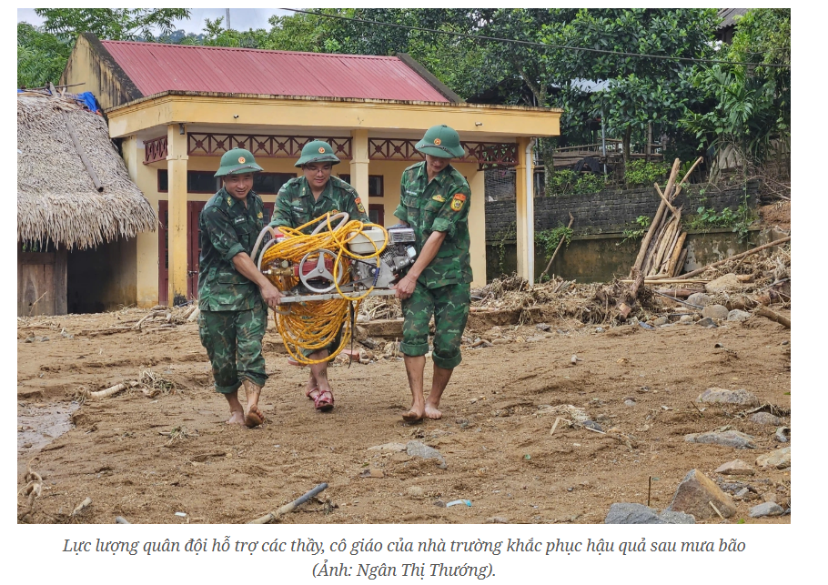 Thầy cô, chiến sĩ đội mưa dọn bùn đất chuẩn bị cho ngày khai giảng